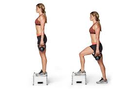 - Stand in front of the step or platform and place the right foot on the step. Hold weights for added intensity.
